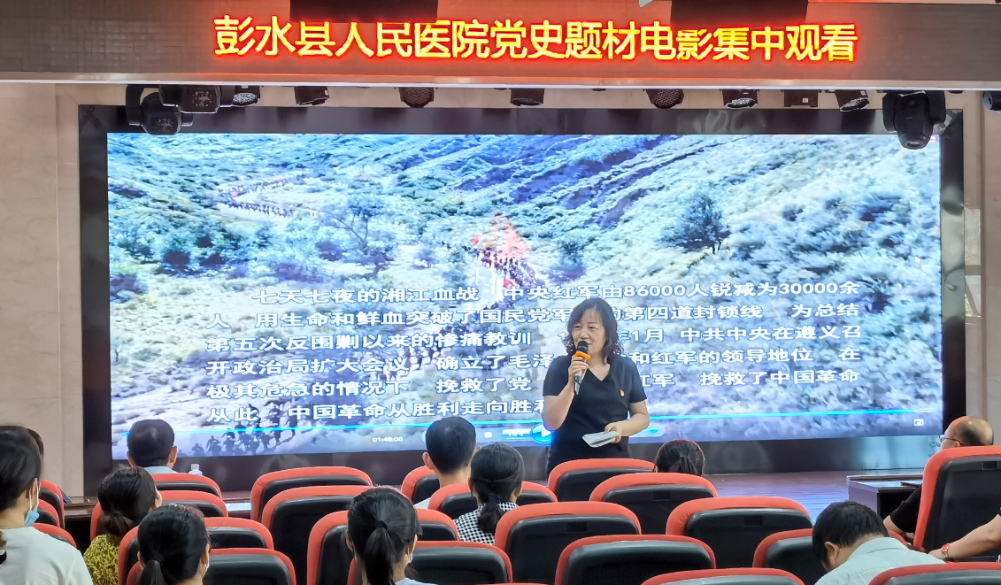 为庆祝中国共产党成立100 周年,深入学习贯彻习近平新时代中国特色社会主义思想,根据县委宣传部《“永远跟党走”——重庆市庆祝建党100周年优秀影片展映观影活动方案》(彭水委宣〔2021〕21号)要求,6月22日下午,我院组织全院不值班的职工在三楼多功能厅集中观看党史题材电影《血战湘江》。