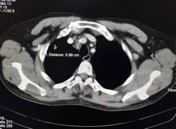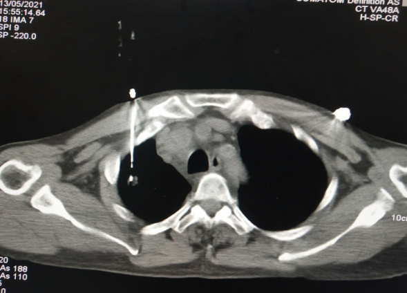 据悉,该患者为中年男性,在重庆体检发现肺部小结节,考虑恶性肿瘤,建议进一步检查治疗,患者因在外治疗不方便,拟回彭水诊治。张厚云主任医师查看后告诉患者,肺部小结节,只有6.9mm,纵膈淋巴结肿大,最短径>2cm,要明确诊断最好的方法是做纵膈淋巴结的超声支气管镜(EBUS)活检,经皮肺穿刺活检因病灶太小,呼吸时小结节还会随着呼吸上下移动,穿刺难度大,取材稍微不好,假阴性率高。经患者及家人商量后,不愿去上级医院行EBUS,选择就在彭水行经皮肺穿刺活检手术。看着患者的信任和一家人期待的眼神,张厚云主任医师带领肿瘤微创团队,手术前认真分析,包括如何控制呼吸运动,如何避开血管等,都做了详细预案,最终顺利完成手术并明确诊断。