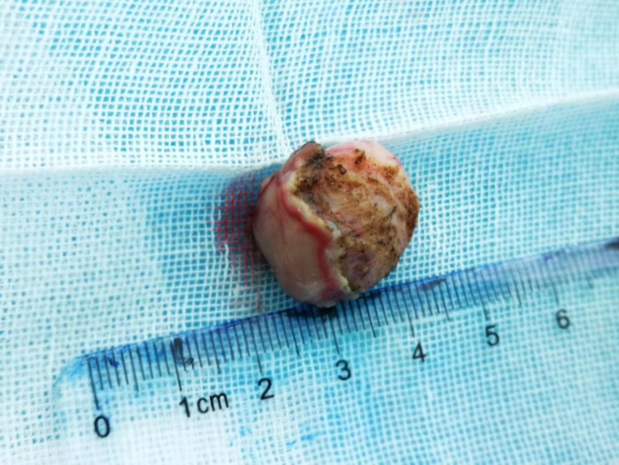 此患者于2020年5月6日在我院常规胃镜检查发现胃底1枚直径约2cm粘膜下隆起样病变,经完善上腹部CT发现此肿瘤向胃壁内外生长,考虑间质瘤可能性大,经科室反复讨论,患者有肿瘤切除指征,考虑外科手术创伤大,患者及家属要求微创手术治疗,经消化内科团队反复讨论后决定,实施经胃镜下肿瘤切除,因肿瘤向胃壁外生长,故要完整切除肿瘤,需将胃壁全层切除后再缝合,2020年5月9日下午在麻醉科的协助下,消化内科团队成功完整剥离肿瘤,手术顺利完成。术后患者生命体征平稳,未诉特殊不适。此手术的成功标志着我院消化内科在内镜诊疗技术方面又上了一个新台阶。