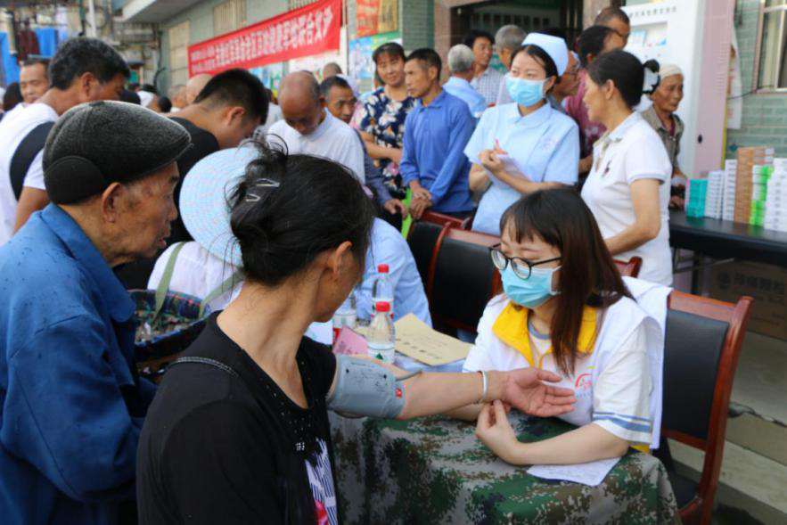黄家镇地处渝黔边区大娄山北缘山地,距县城46公里,道路蜿蜒曲折,地貌复杂。早上9时30分,医护人员按计划到达黄家镇中心卫生院,看到了早已等候在此的村民,于是不顾路途颠簸劳顿,在黄家镇中心卫生院领导及医务人员的帮助下,立即着手为村民进行义诊义检服务。只见活动现场人头攒动、人群络绎不绝,医务人员耐心细致的为村民做检查、分析病情,讲解注意事项,详细了解他们的身体状况,并免费赠送治疗相关药品。我院“予善”志愿者服务队队员不顾酷热,维持现场秩序的同时为群众分发健康知识手册,宣讲健康生活理念,为村民量血压、测血糖。