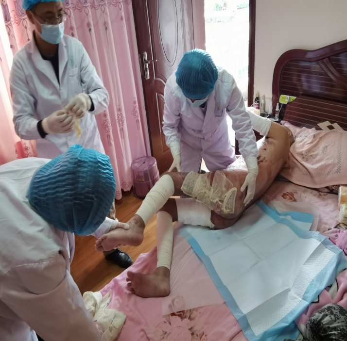 为了将党史学习教育融入日常,河豚直播体育app外三科护理团队利用休息时间,不惧路途艰险、路程长,前往保家、普子、高谷等多家养老院,以及到龚滩艾坝村、贵州沿河新景镇等县外村镇,无偿为患者解决实际问题。大壮(化名)是一名重度烧伤患者,听闻河豚直播体育app外三科在烧伤诊疗方面有一定的治疗经验,便入院接受治疗,经过几次的削痂、取皮植皮术后,即将进入整形抗瘢痕治疗阶段时,因经济原因大壮放弃后续治疗出院。外三科医护人员一直心系大壮的恢复情况,担心家中环境、自行换药等因素会导致感染发生,电话联系家属取得同意后,便安排医护团队来到大壮家中,他们仔细评估创面情况,现场演示正确的换药方式,对大壮饮食活动给出指导意见。看着医护人员细致入微的指导,大壮和家人感到十分暖心,甚至留下了感动的眼泪。