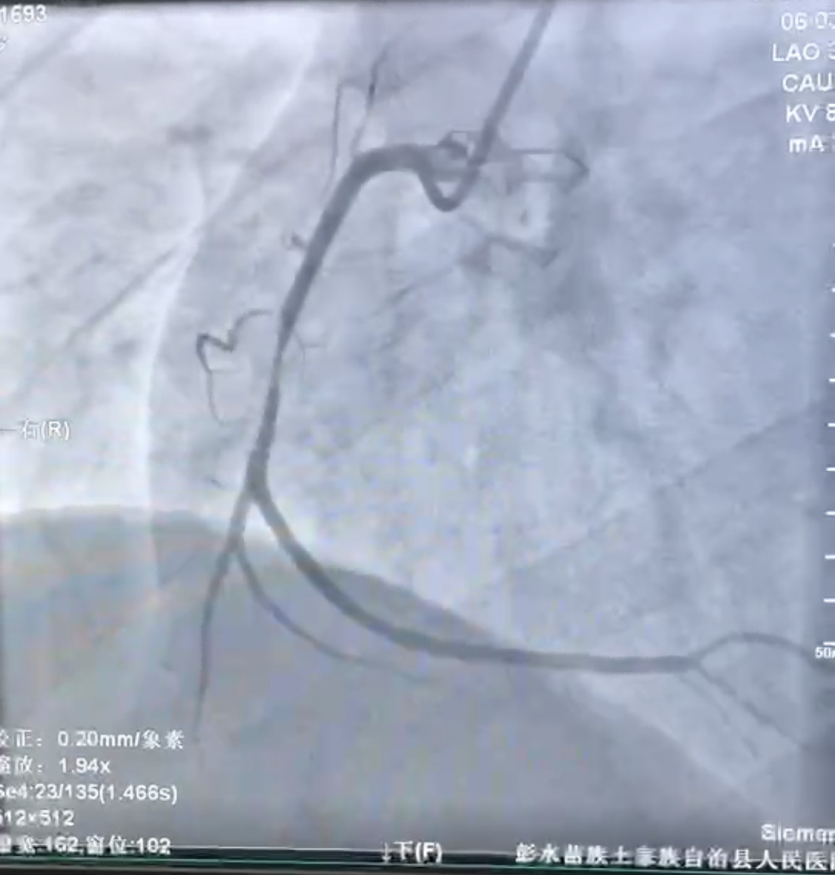 47岁的谢先生因胸痛半月,再发加重3小时,到河豚直播体育app就诊,急诊科张波医师立即行心电图等检查后,考虑急性心肌梗死,经心内科吴玉兰主治医师会诊后立即启动胸痛中心绿色通道,与患者及家属沟通后行急诊冠状动脉介入治疗。通过冠脉造影检查,患者右冠中段次全闭塞,可见血栓影(见图1)。