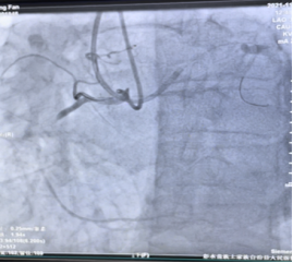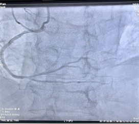 第2例是一位高龄男性患者,84岁冉爷爷1月前因“突发胸痛”就诊,诊断为急性心肌梗死,术中造影提示罪犯血管为前降支,右冠近端完全闭塞,考虑慢性闭塞性病变,行急诊PCI后治疗患者好转出院,医生建议患者择期在IVUS指导下行右冠支架植入术。同样,在陈元友主任的指导下,王欣医师行双侧造影,在钢丝通过闭塞病变后,将IVUS导管放置在血管远端,采取自动回撤模式,可见闭塞处主要为纤维病变,测得管腔最狭窄面积为2.5mm2,病变长度达34.7mm,已经达到介入手术指征,在右冠长病变处成功植入1枚支架,术后IVUS测得最狭窄处管腔面积为6.2mm2,,IVUS及冠脉造影提示术后支架贴壁良好,远端血流恢复正常,患者术后恢复良好。见图2、图3。