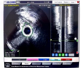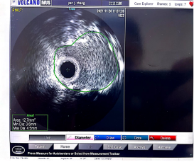第1例是一位老年男性患者,2年前曾在外院行冠状动脉内支架植入术,平时未规律服用抗血小板药物,因“呼吸困难”来院就诊,冠状动脉造影提示左主干开口狭窄约80%,右冠开口狭窄约70%,患者经治疗后好转出院,预约择期行IVUS指导下处理左主干病变。在陈元友主任医师的指导下,王欣主治医师将IVUS导管放置在血管远端,采取自动回撤模式,测得左主干开口面积为2.9mm2,已经达到介入手术指征,在左主干开口成功植入1枚支架,术后IVUS测得左主干开口面积为12.7mm2,,术后支架贴壁良好,患者左主干病变解除,患者术后恢复良好。(见图1)。