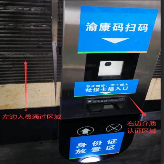 有码入口通道进入人员自行通过门诊闸机前提条件是注册了渝快码或渝康码,门诊闸机通道支持渝快码、渝康码、身份证、医保卡任意一种介质的认证,按下图所示扫码或放置身份证或插卡医保卡到对应位置即可开门自行通过进入门诊区域,遵循“右边验证,左边通行”原则。