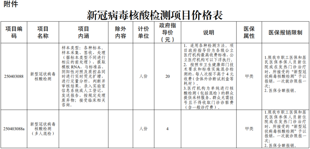 按照《通知》要求,检测项目价格含检验相关的试剂等耗材,为各级医疗机构最高指导价格,不得上浮。我院也将同步调整完善新冠病毒核酸检测项目(含单、混检)的医保报销属性及报销限制(具体详见下图)。
