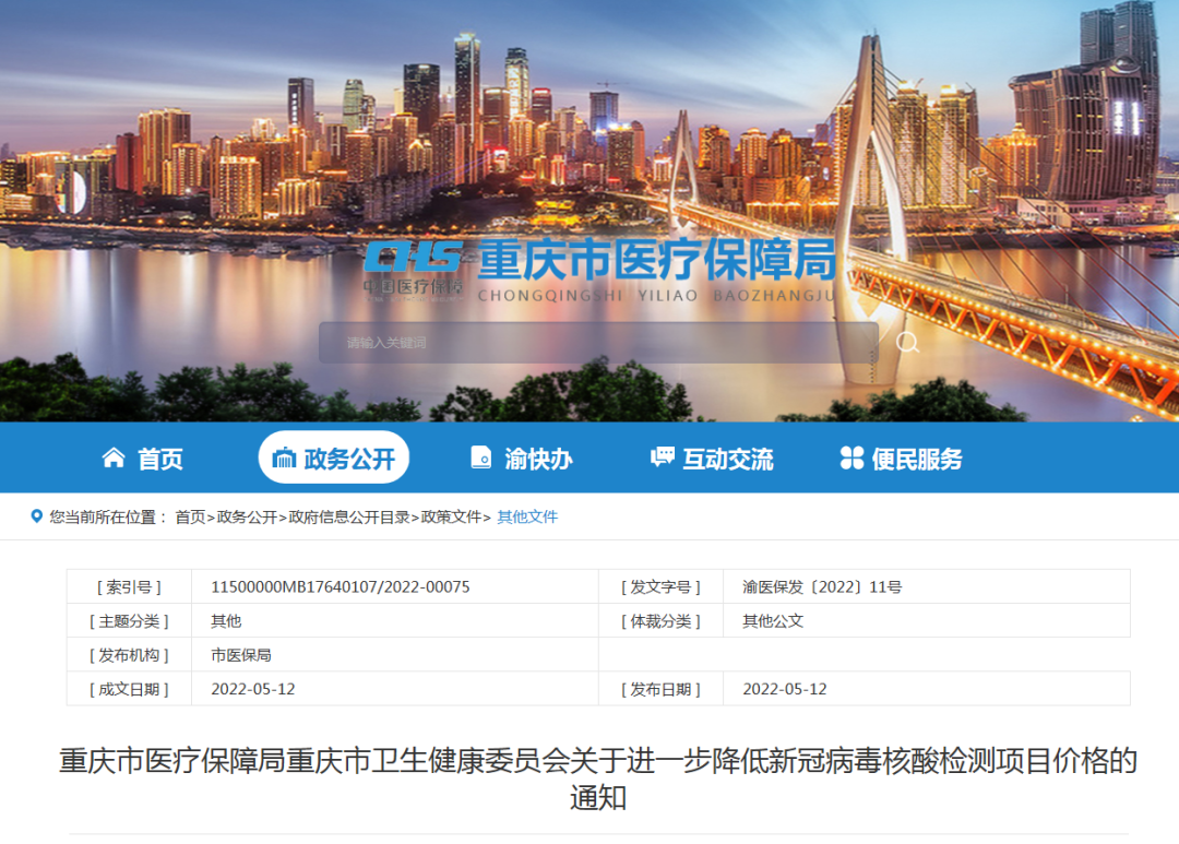 5月12日,重庆市医疗保障局、重庆市卫生健康委员会印发《关于进一步降低新冠病毒核酸检测项目价格的通知》,5月15日零时起,降低公立医疗机构新冠病毒核酸检测项目的政府指导价。我院也将按要求实行单人单检降至不高于每人份20元,多人混检统一降至每人份不高于4元的指导价格。