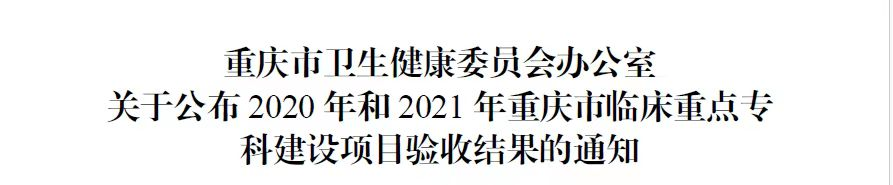12月22日,重庆市卫生健康委员会办公室下发《关于公布2020年和2021年重庆市临床重点专科建设项目验收结果的通知》,我院重症医学科市级临床重点专科建设项目验收合格,被评为“重庆市临床重点专科”。
