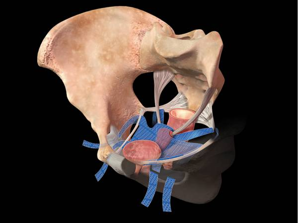 经阴道植入补片全盆底重建手术通过固定在皮肤、皮下以及盆腔筋膜和韧带上的网带,可以从骶棘韧带和肛提肌腱弓水平提升,并承托盆腔脏器使其恢复到正常的解剖位置,从而可以分别纠正盆底不同部位的缺陷,达到对整个薄弱的盆底进行修复,