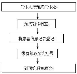 门诊大厅预约门诊处登记 →预约就诊科室→将患者信息记录登记→就诊当天到预约门诊处缴费领取预约挂号单→到预约科室就诊