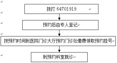 拨打64701919→预约后由专人登记→按预约时间到门诊大厅预约门诊处凭身份证件缴费领取预约挂号单→到预约科室就诊。
